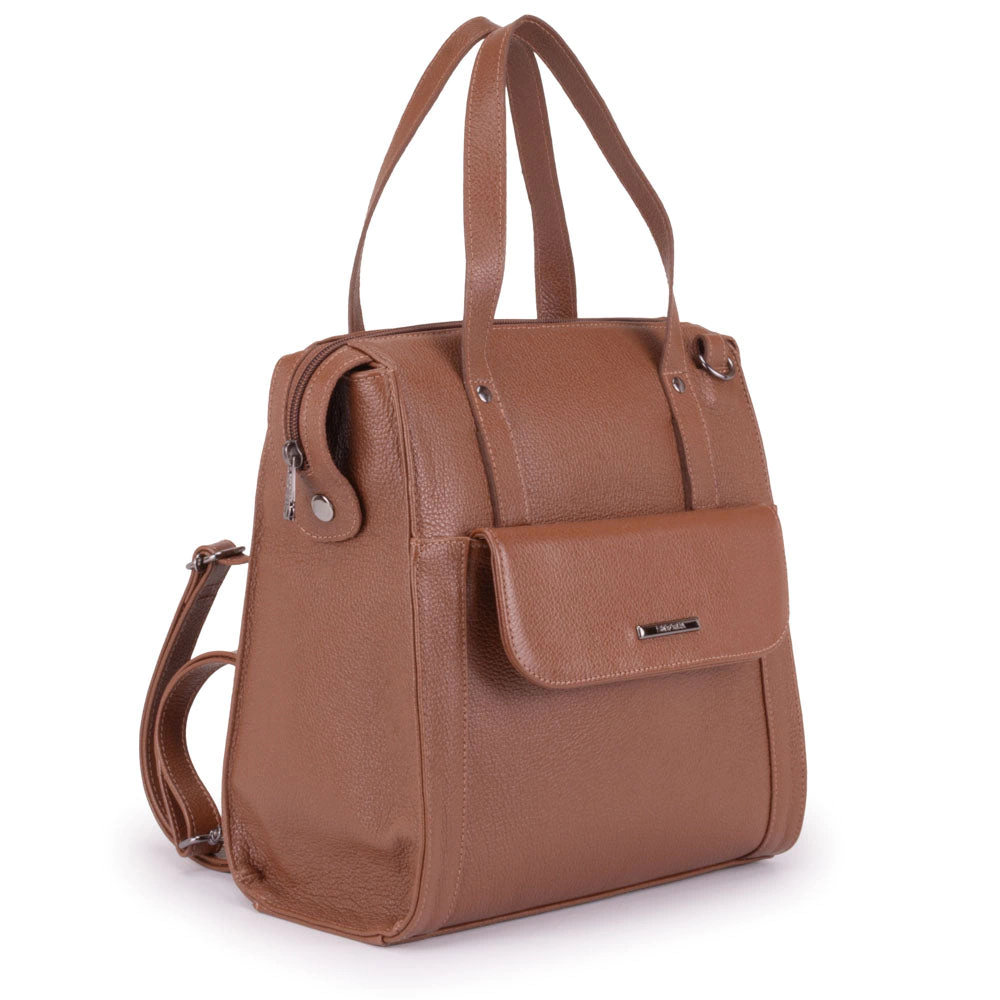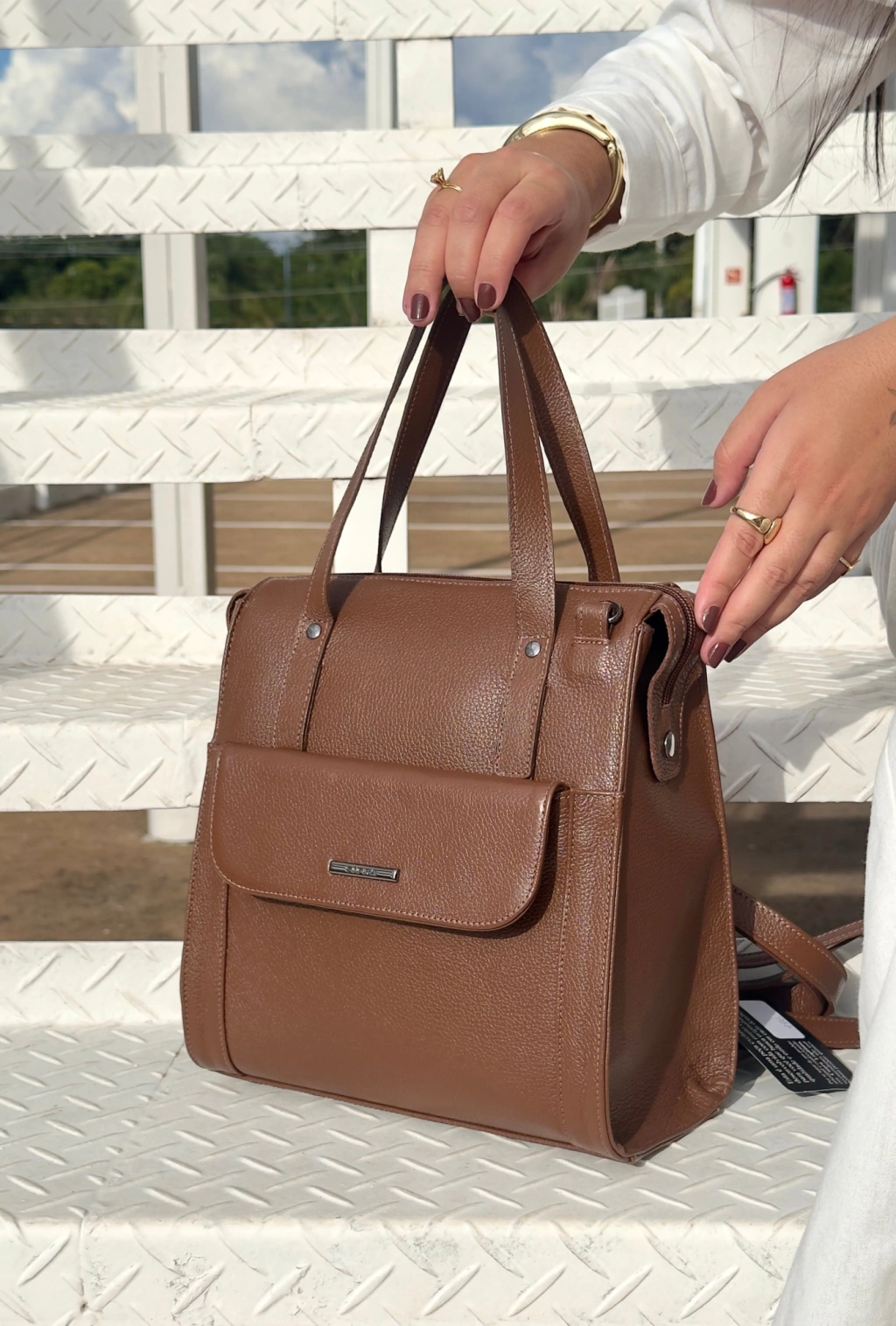 A Mochila Feminina Couro Marrom Amsterdã possui uma alça de mão confortável e alças ajustáveis para o uso nas costas, garantindo conforto ao carregar seus itens. O compartimento principal com fechamento em zíper oferece segurança para os seus pertences, e o bolso frontal com aba permite fácil acesso a itens menores, como celular ou chaves.